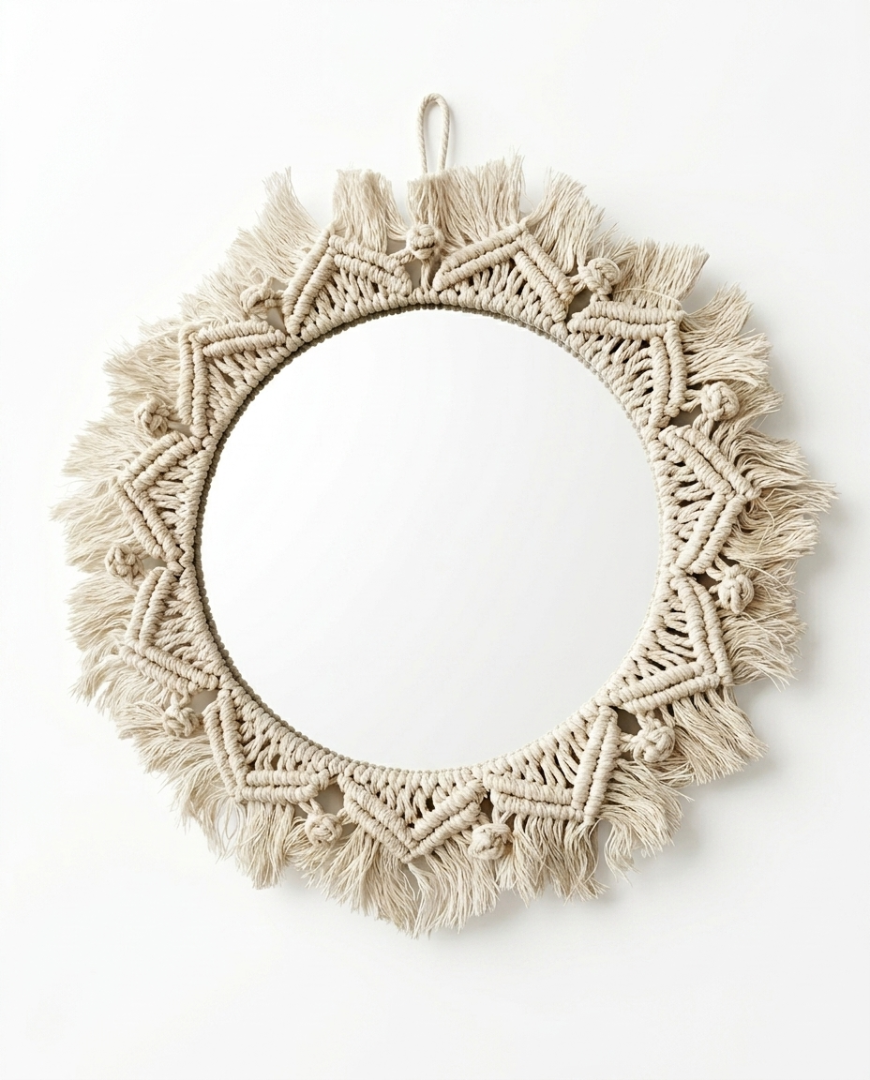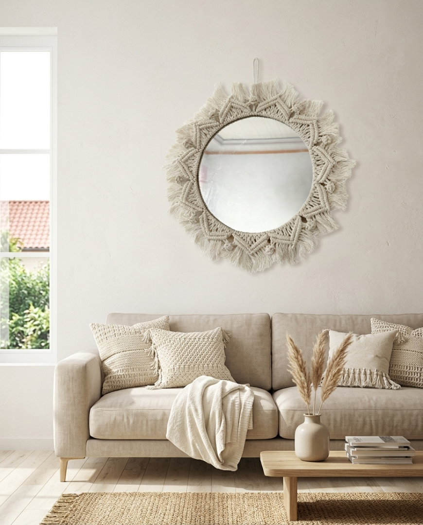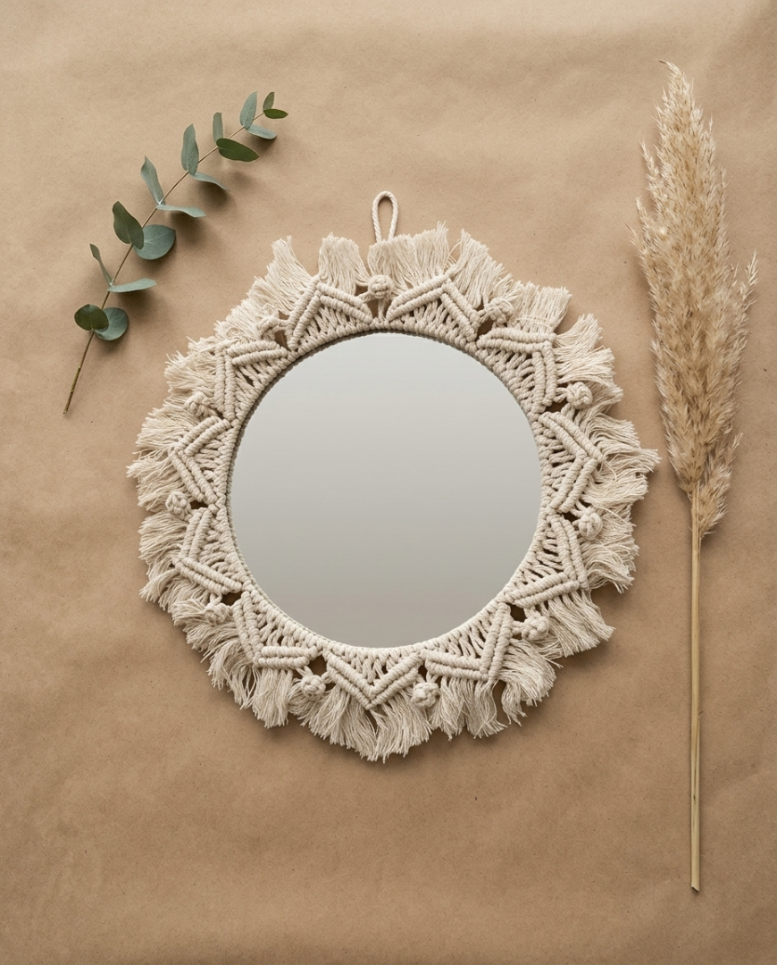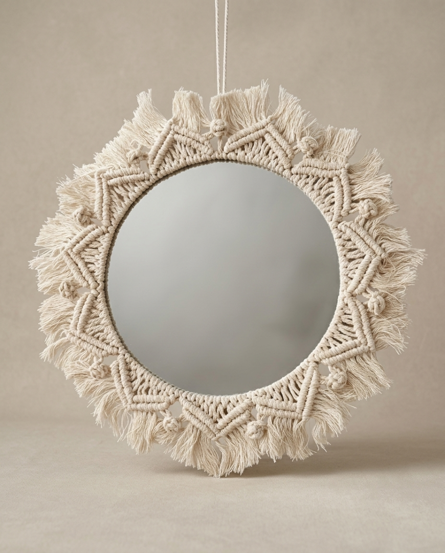 Додайте вашому дому особливої атмосфери та затишку за допомогою автентичного декору. Це настінне дзеркало обрамлене витонченим плетінням у техніці макраме, виконаним з особливою увагою до кожного вузла. Модель «Промінь світла» поєднує в собі функціональність та легкість натуральних матеріалів. Її сонцеподібна форма та фактурний орнамент створені для того, щоб наповнювати простір сяйвом та візуально розширювати межі вашої кімнати.