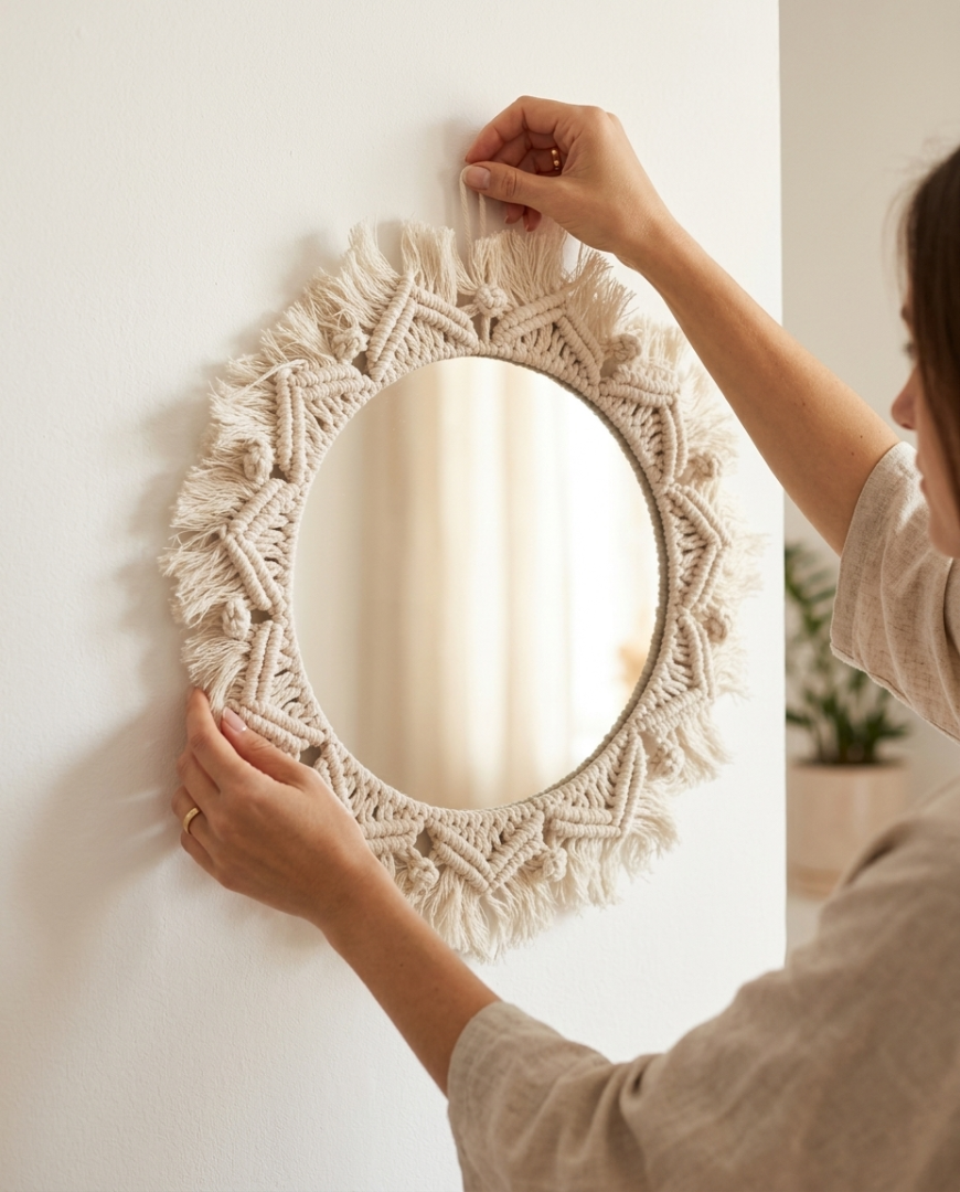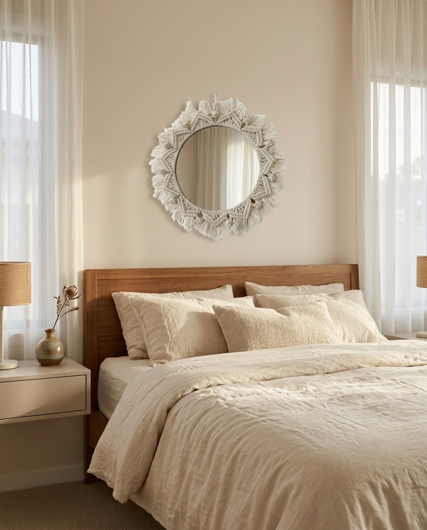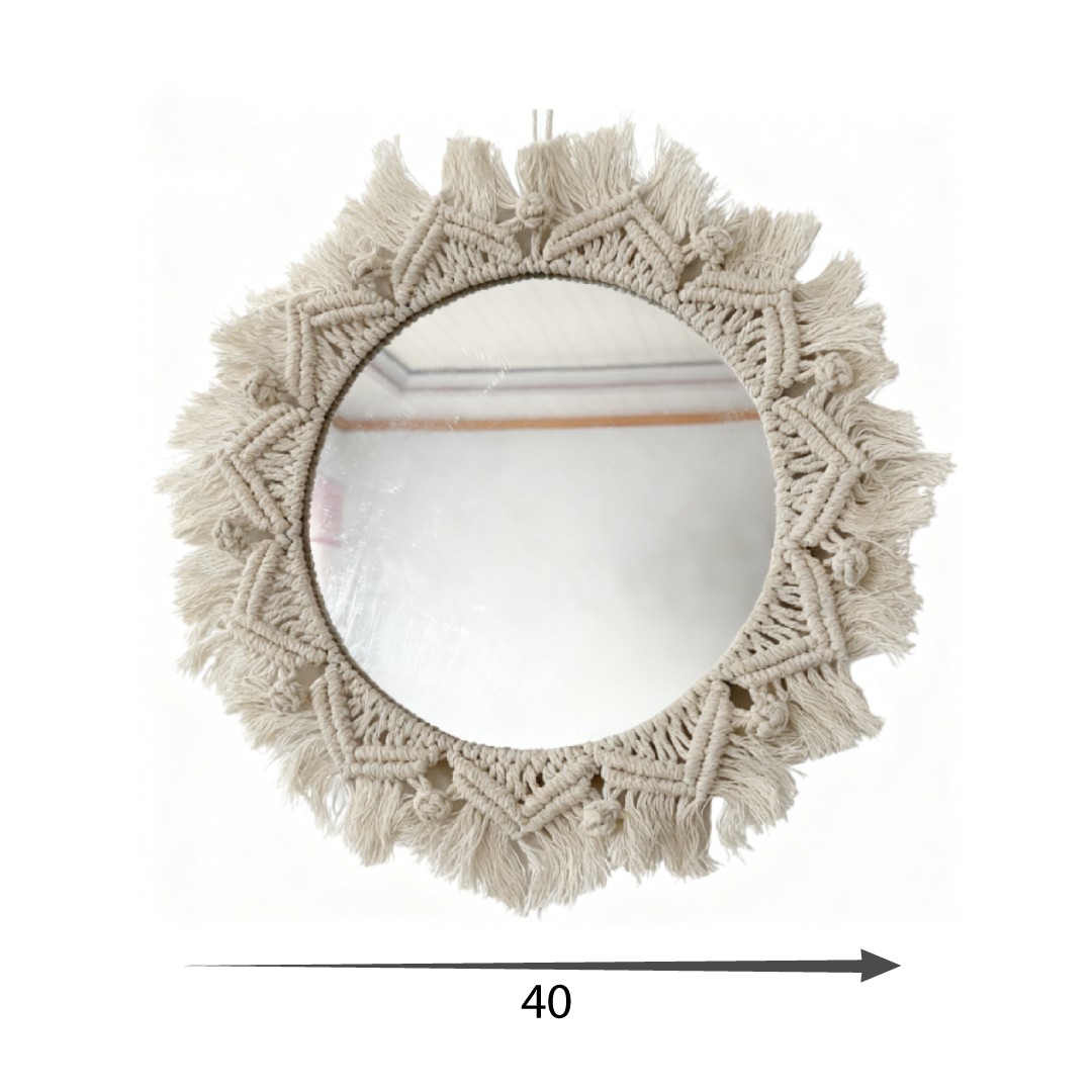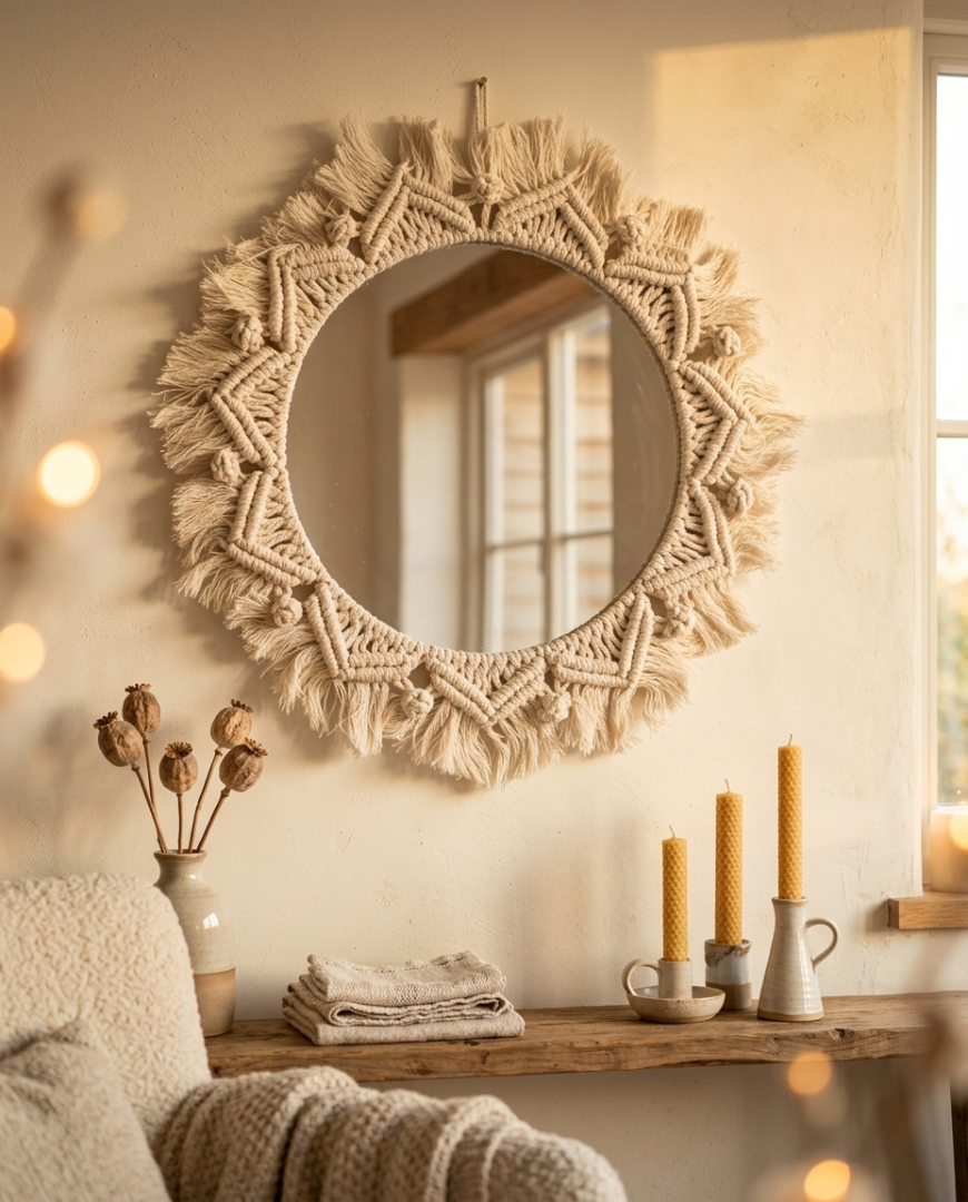 Додайте вашому дому особливої атмосфери та затишку за допомогою автентичного декору. Це настінне дзеркало обрамлене витонченим плетінням у техніці макраме, виконаним з особливою увагою до кожного вузла. Модель «Промінь світла» поєднує в собі функціональність та легкість натуральних матеріалів. Її сонцеподібна форма та фактурний орнамент створені для того, щоб наповнювати простір сяйвом та візуально розширювати межі вашої кімнати.