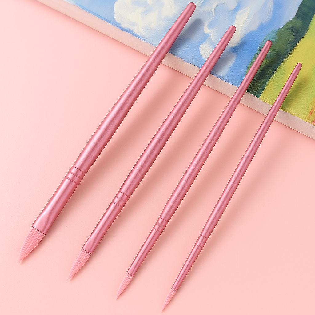 Цей витончений набір рожевих пензлів стане ідеальним вибором як для початківців, так і для досвідчених художників. До набору входять чотири пензлі з круглим ворсом різного розміру, які забезпечують точність і контроль при роботі з деталями, заливками та контуром.