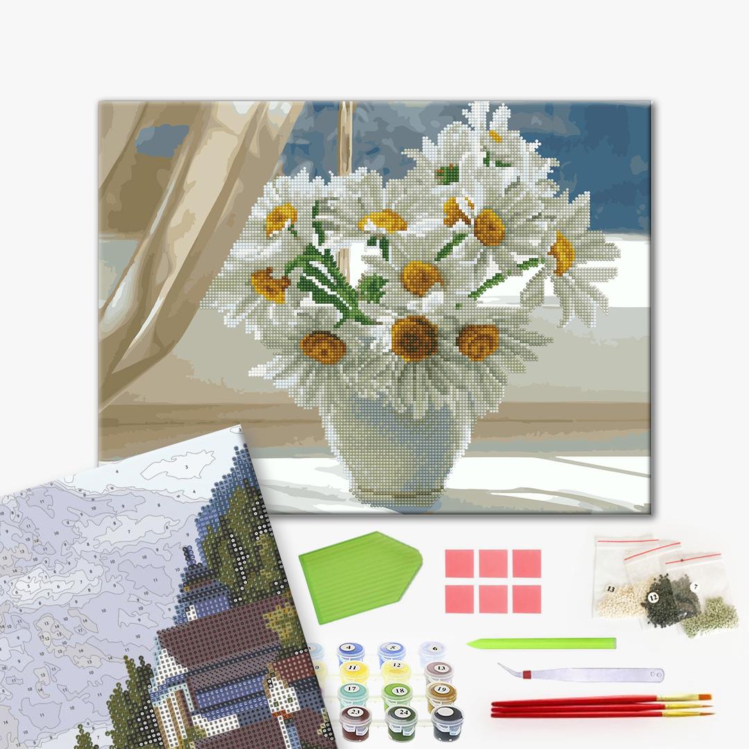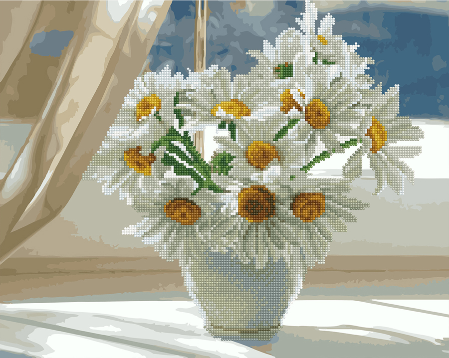 Алмазна мозаїка Ромашки в білій вазі на вікні GZS1174