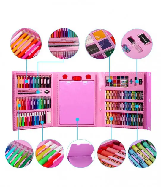 • Компактність та портативність: Легко беріть свої творчі інструменти з собою, завдяки компактному дизайну набору та можливості перетворення підставки в мольберт.