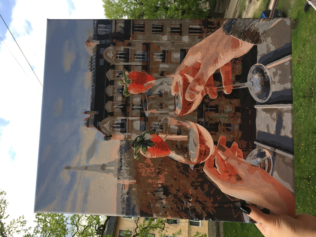 • полотно на дерев'яному підрамнику з нанесеною пронумерованою схемою майбутньої картини. Всі сегменти додатково пофарбовані в тон кольорів, якими буде зафарбовувати полотно