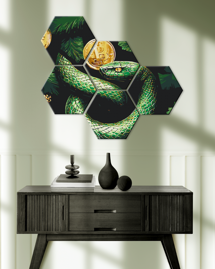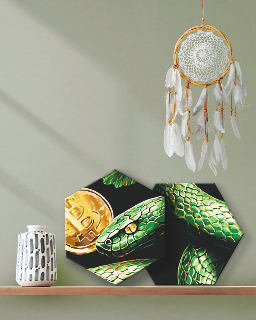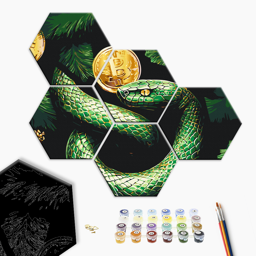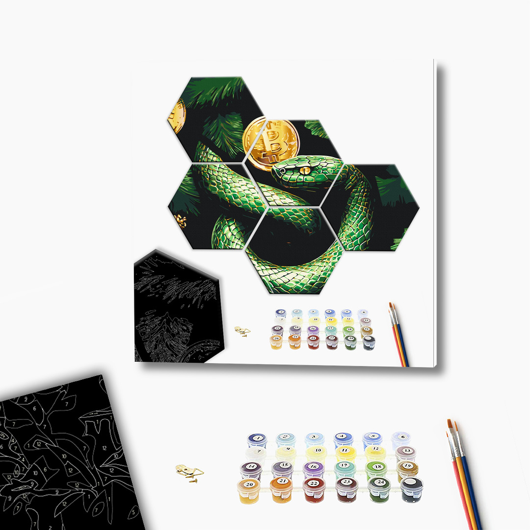 Стильна змія разом з золотою монетою, втілює силу та достаток. Картина виконана на чорному полотні, а деякі елементи можна розфарбувати фарбами-металіками для WOW-ефекту.