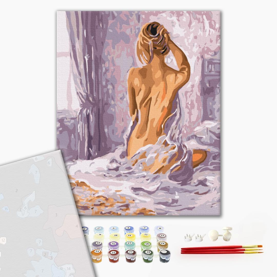 • полотно на дерев'яному підрамнику з нанесеною пронумерованою схемою майбутньої картини. Всі сегменти додатково пофарбовані в тон кольорів, якими буде зафарбовувати полотно