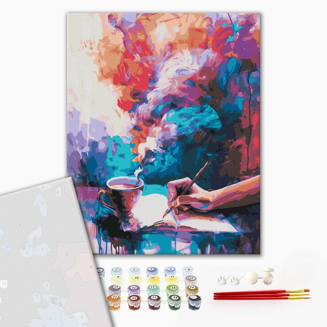 • полотно на дерев'яному підрамнику з нанесеною пронумерованою схемою майбутньої картини. Всі сегменти додатково пофарбовані в тон кольорів, якими буде зафарбовувати полотно