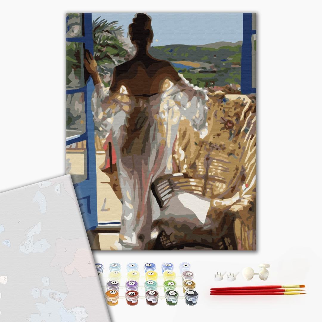 • полотно на дерев'яному підрамнику з нанесеною пронумерованою схемою майбутньої картини. Всі сегменти додатково пофарбовані в тон кольорів, якими буде зафарбовувати полотно