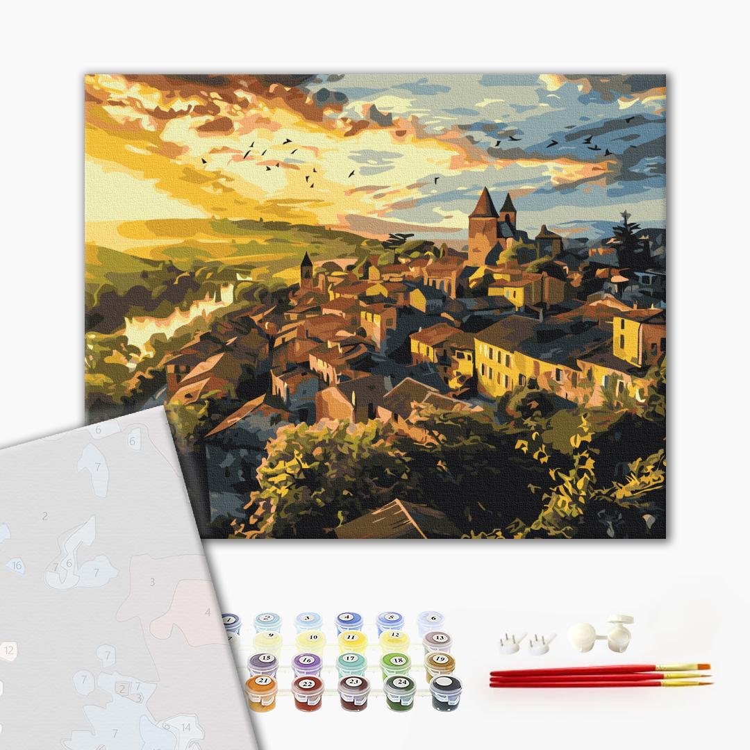• полотно на дерев'яному підрамнику з нанесеною пронумерованою схемою майбутньої картини. Всі сегменти додатково пофарбовані в тон кольорів, якими буде зафарбовувати полотно