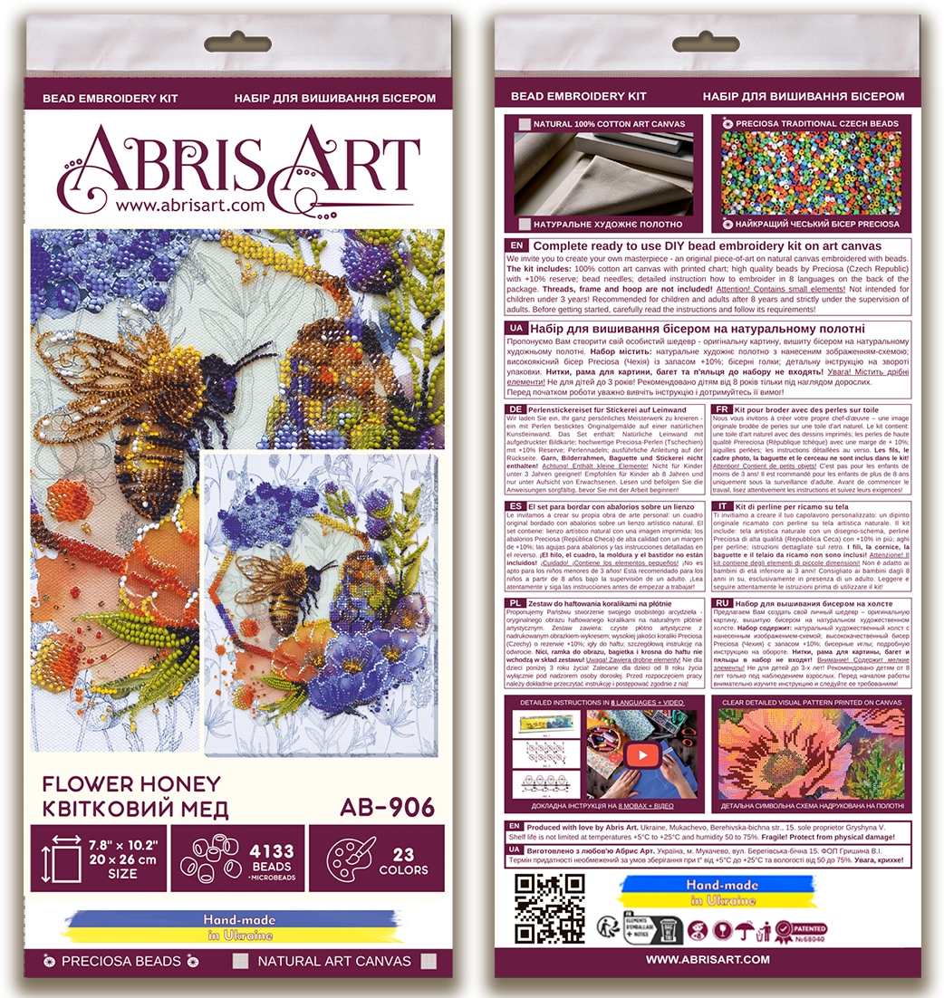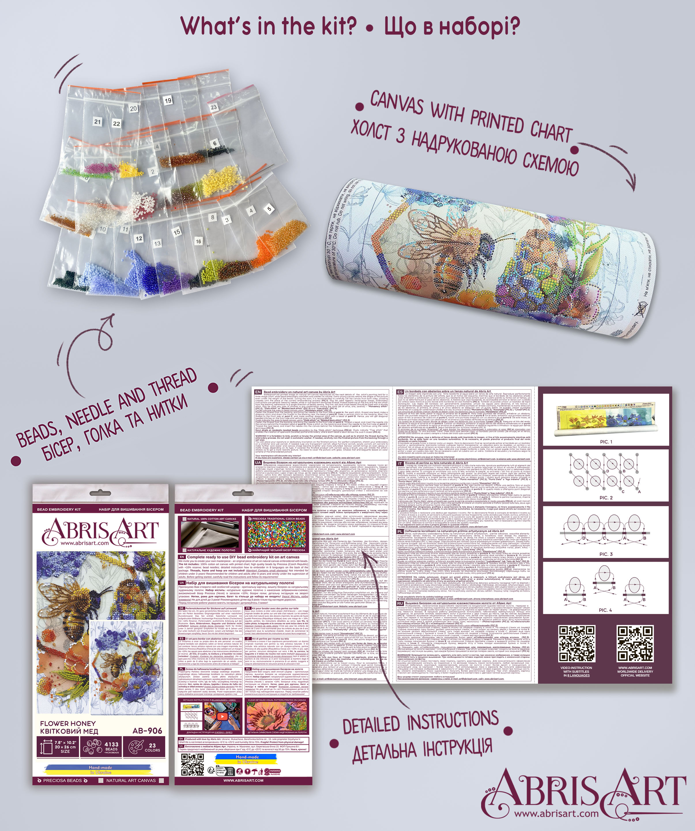 У комплекті зазвичай є натуральний холст із нанесеною схемою, чеський бісер Preciosa Ornela, бісерні голки та зрозуміла покрокова інструкція — усе, що потрібно навіть початківцю.