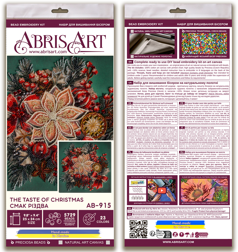 У комплекті зазвичай є натуральний холст із нанесеною схемою, чеський бісер Preciosa Ornela, бісерні голки та зрозуміла покрокова інструкція — усе, що потрібно навіть початківцю.