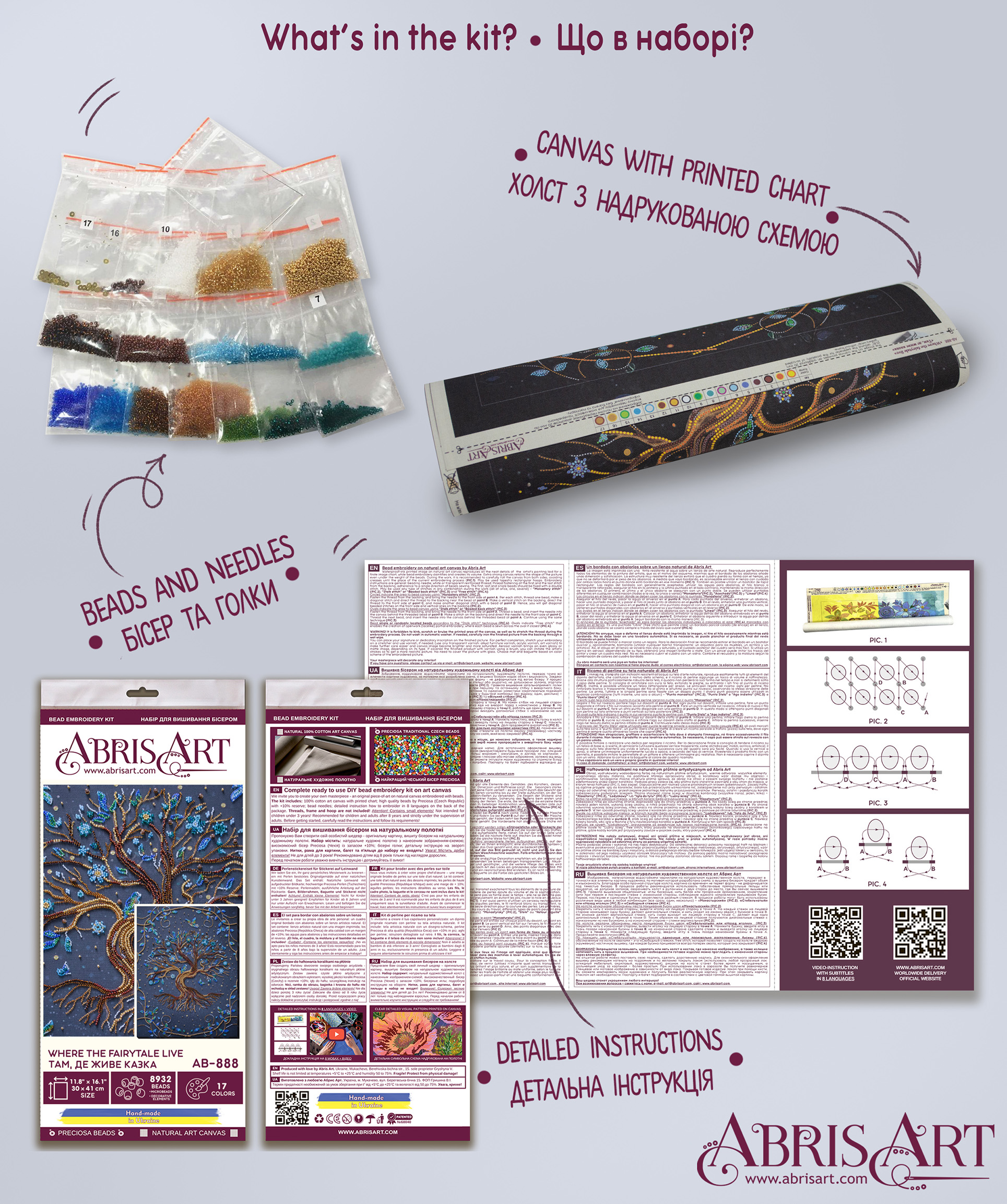 У комплекті зазвичай є натуральний холст із нанесеною схемою, чеський бісер Preciosa Ornela, бісерні голки та зрозуміла покрокова інструкція — усе, що потрібно навіть початківцю.