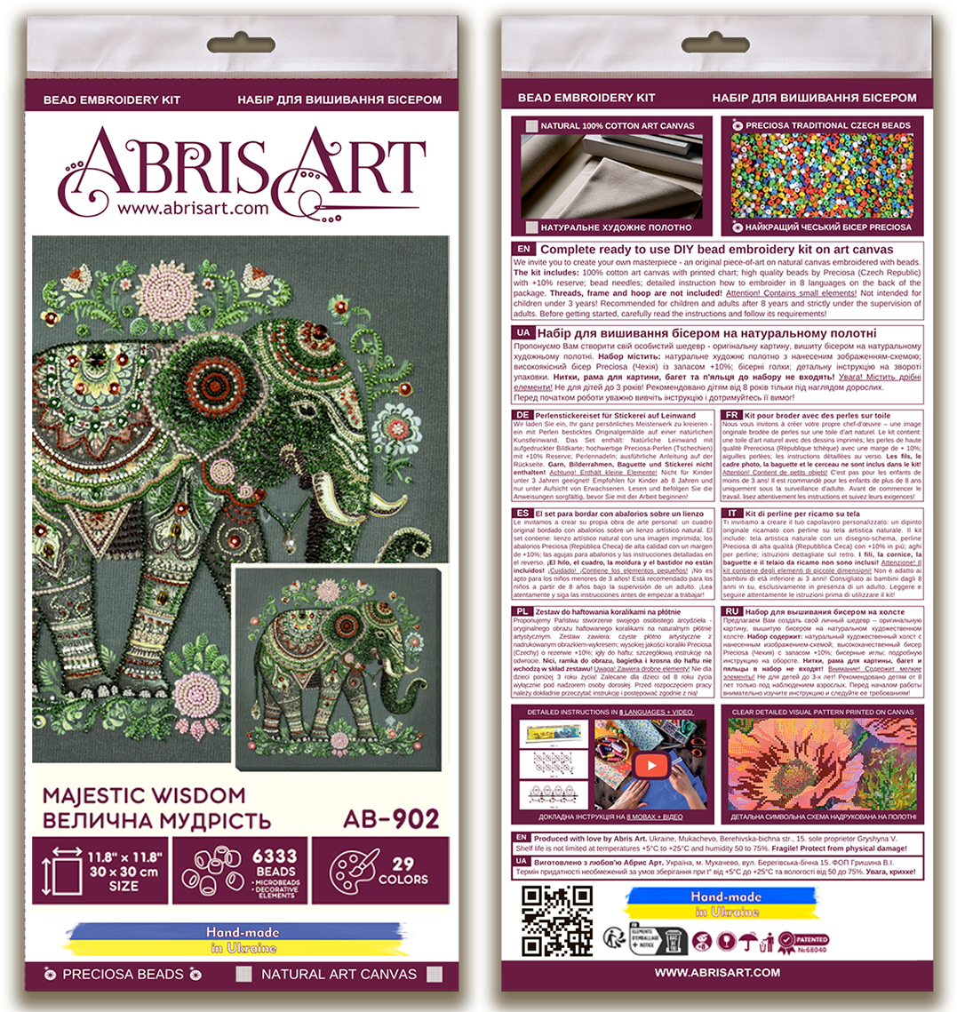 У комплекті зазвичай є натуральний холст із нанесеною схемою, чеський бісер Preciosa Ornela, бісерні голки та зрозуміла покрокова інструкція — усе, що потрібно навіть початківцю.