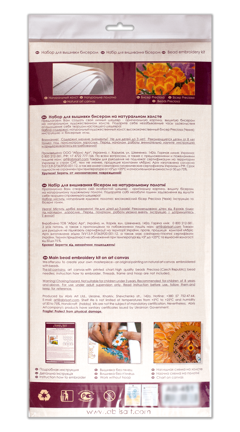 У комплекті зазвичай є натуральний холст із нанесеною схемою, чеський бісер Preciosa Ornela, бісерні голки та зрозуміла покрокова інструкція — усе, що потрібно навіть початківцю.